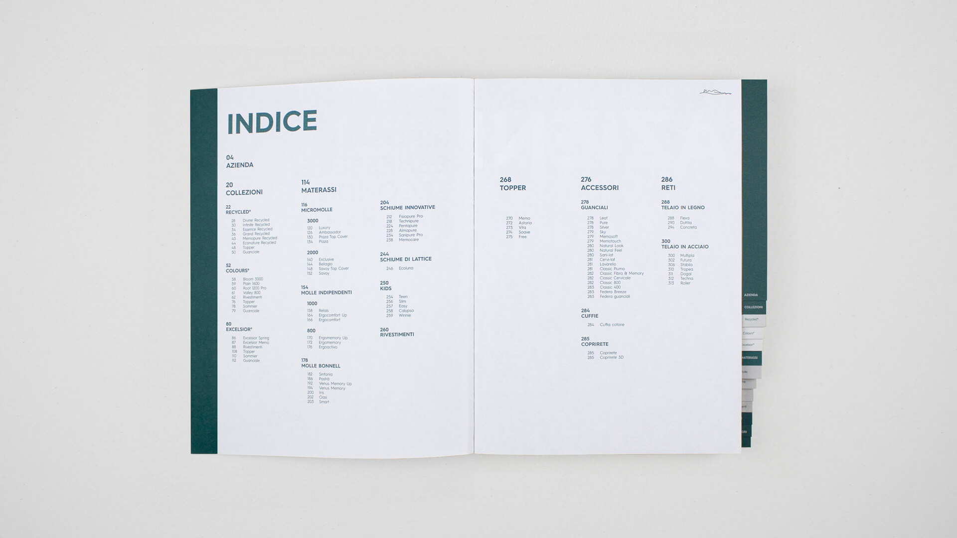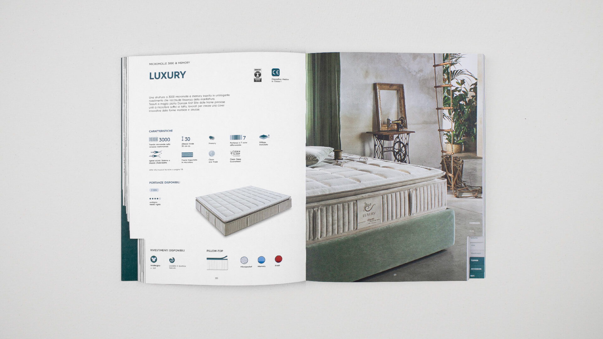 Per rendere immediata l’individuazione dei vari capitoli, abbiamo introdotto una rubricatura chiara e intuitiva. Ogni sezione è stata pensata per catturare l’attenzione e guidare l’utente attraverso un’esperienza di lettura fluida, che stimola la curiosità e l’interesse verso ogni singolo materasso. Il catalogo non è solo un elenco di prodotti, ma un racconto visivo e testuale. Ogni materasso è descritto attraverso testi accattivanti, fotografie ambientate e tecniche, schemi e icone, il tutto arricchito da dettagli tecnici essenziali. Questa narrazione multidimensionale consente di esplorare non solo l’estetica, ma anche le specifiche tecniche, creando un legame emotivo e informativo con il cliente.